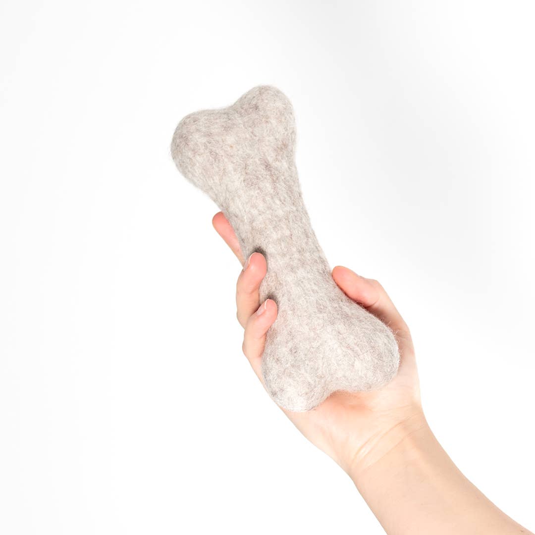 Ein Knochen gehört in jeden Hundenapf ... und wenn er Knut heißt, in die Spielzeugkiste deines Buddys. Der natürliche, feste Wollfilz animiert zum Kauen, ist dabei aber sanft zu den Zähnen und völlig unbedenklich. Ein nachhaltiges Hundespielzeug, wie es eben sein soll.