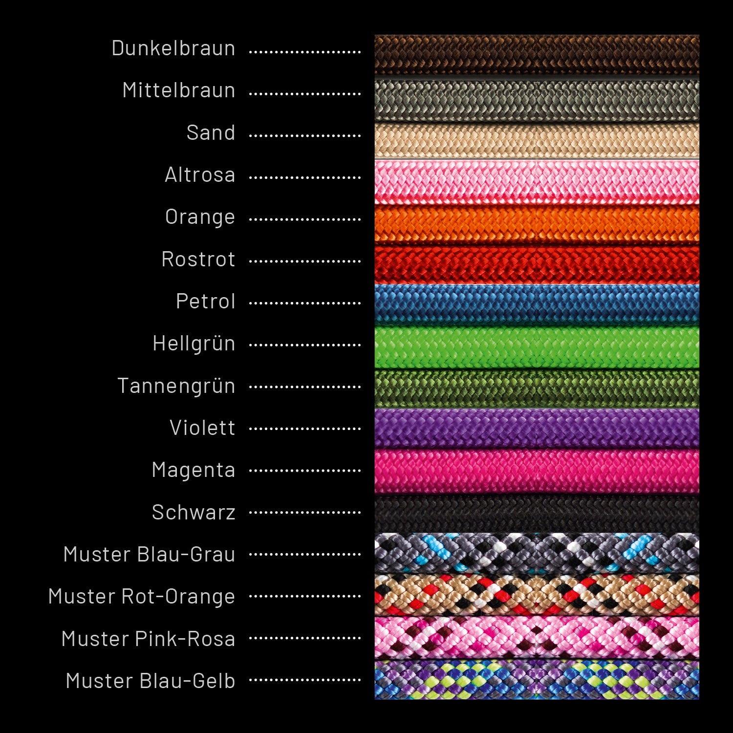 Bitte beachten Sie die Abbildungen bei der Auswahl von Farbe und Ausführung! Farbdarstellungen können je nach Monitor leicht abweichen. Alle Leinen sind mit einem robustem, rostfreiem Edelstahl-Karabiner zur Befestigung an Halsband oder Geschirr versehen.
